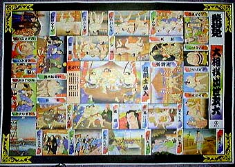 早くゴールに着いた者を勝ちとする遊び。 回り双六と飛び双六の2種類に大別される。 回り双六はさいころを振って出た目の数だけ駒を上がりの方向に進めるもの。 飛び双六はマス目に何の目が出たらどのマス目に移動するかが記されていて、 さいころを振ってその通りに移動するものである。 記されていない目が出たときは基本的にそこを動くことはできない。 回り双六と飛び双六をミックスさせたものも存在する。 また通常コースは一本道だが、途中で複数のコースが存在し、条件によって コースが変わる振り分け双六というものも存在する。 |