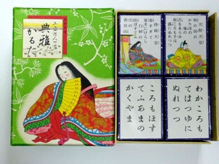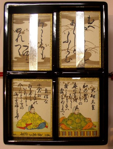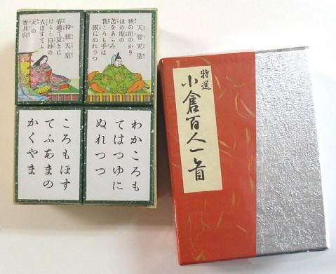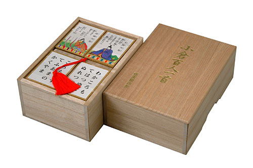 藤原定家が編纂した小倉百人一首を一首ごとに読み札と取り札を作ったもの。本来百人一首とは百人の人間の歌を一人一首ずつ集めた歌集のことであるが、この小倉百人一首があまりに有名であるため、通常百人一首といえば、小倉百人一首を指す。