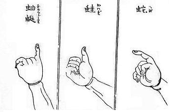 片手の3すくみ拳。親指(蛙)、人差し指(蛇)、小指(なめくじ)の3種類。『地雷也豪傑譚(じらいやごうけつたん)』はこの3すくみが元になっている。