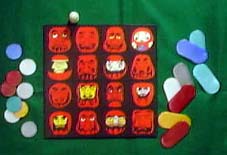 である。拮抗したり一方的になったり意外な結果になって面白い。 妙な名前は作者が日本語の「色の遊び」と付けたつもりなのだが誤っているため。ボードに ダルマがデザインされており、東洋的な味を狙っている。 |