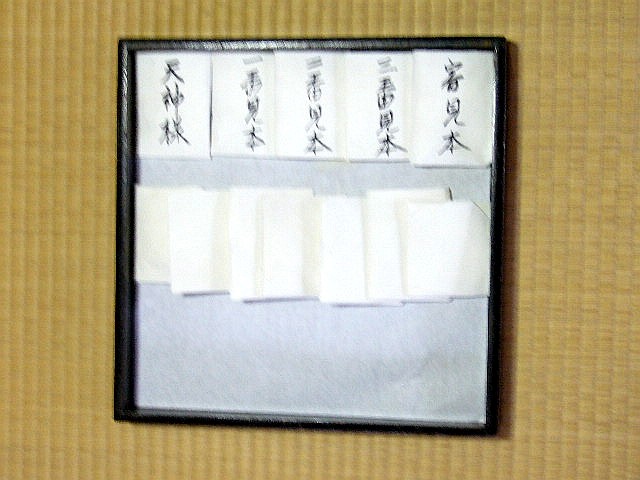 一口含むと茶の苦さと甘茶の甘さが広がる。最も甘くない茶ではないとは思うが、どの程度に甘い茶かというと、これはわからない。見当をつけて和紙を折る。 かかりが順番に席の名前を読み上げる。呼ばれた者は自分の選んだ番号を読み上げる。一つの茶に対して、一番から客まで4種類出揃うのが面白い。