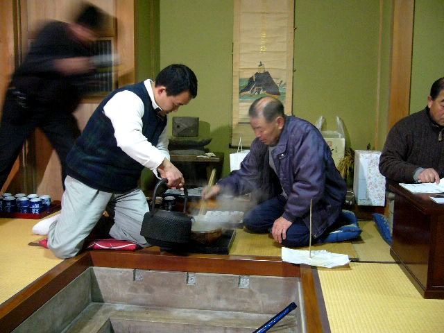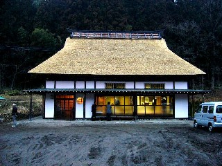 お茶講の家はバス停から3分ほどのところにあった。茅葺きの大きな家である。中では何人かの人間が囲炉裏に当たっている。上がり込んで火に当たらせてもらうと、地元の人のほかにも何人か見学にている人がいることが分かった。  地元の人に話を聞くと、お茶講は元々白久保の集落の家家の持ち回りで行っていたのだが、広い部屋を持つ家が少なくなったため、20年ほど前にお茶候の家を建てたとのことであった。