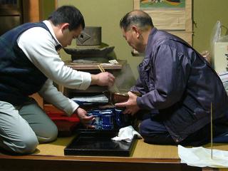 準備開始。持ち出されたのは煎茶、甘茶、ミカンの皮。これを焙烙でカラカラにして石臼で挽いて粉にする。できあがったものは和紙に取り、これから配合にかかる。スプーンである茶は煎茶3杯、甘茶2杯、ミカンの皮1杯、というように取り、4種類のお茶を作る。できあがるとそれぞれを3つに分ける。都合12に分け、これを一つ一つ畳んで包みにする。  一方では行灯作りだ。木枠に張った和紙に文字を書き今年用の行灯を作る。  3時、準備は一段落し解散。