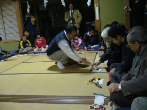 まず、子供たちが行灯を持って神社まで行く。神社から1個ずつ行灯を道端に置いてくる。神を迎える道案内である。部屋の周囲にずらっと座布団を並べ、参加者たちが座る。この日は村の者立ちだけという決まりだが、特別に参加することを許された。最近は集落の者だけでは少ないのだそうだ。各人の前には、和紙が一枚おかれる。そこには場の名前と「一、二、三」の文字が2つずつと客という文字が書いてある。予想を言った後、その部分を折って確認するのである。