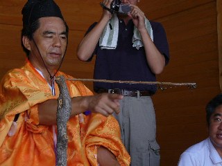 蜘蛛の闘いが見られるのは、鹿児島県加治木町と、ここ四万十市の2ヶ所だけである。以前は中村市と言っていたが、合併で四万十市となった。高知からJRの特急で約1時間半。普通列車だと3時間ほどかかる。この町の一條神社で行われる「女郎ぐも相撲」が今回の目的。朝9時からと早いので、前日に入り、駅前のビジネスホテルに宿をとる。駅は町の外れにあるため、中心部までは15分ほど歩かなければならない。朝8時半に宿を出て神社に向かう。大きなビルはあるが寂しい感じだった町は中心に近づくにしたがって頼もしい町並みになっていった。会場となる一條神社は町の中心部。朝9時の競技開始というので、事前準備から見ようと行ってみると、そこには高い石段が待ち受けていた。登ってみると山頂に確かに神社。その境内の一角にテントが建てられ準備の真っ最中。建物の一つの前に椅子が並べられ観客席になっている。石段を上がったところに受付が設けられ、準備完了。