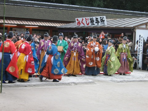 京都市の下鴨神社で1月4日に行われる行事。蹴鞠保存会による解説と実演がある。新春の京都。寺社の多い町だけに大変な混雑である。4日、地下鉄の終点で降り、下鴨神社へ。入り口はすぐにわかったが、参道の長いこと。うっそうとした林を抜け、大きな門が待ち受けてくれる。くぐると、大きな広場。しかし周囲には三重、四重の人垣。まだ一時間前だというのに、これはキツイ。とても写真は撮れそうもない。広場の一方は拝殿、もう一方はやはり有料の観覧席。いったいいくらぐらいするのかな、と席の入り口に回り、切符を切っている巫女さんに聞いて見ると2000円とのこと。たかだか高さ1mほどの高さに良い値段をつけるな、と思ったが、あと一時間立って待つ上に、蹴鞠の間も立ち続け、よい画像が撮れないとなると、この2000円高く思えないから不思議だ。切符売り場に行って2000円を払い、先程の巫女さんの元へ戻り観覧席へ。一番前が取れないと撮影しづらいので前の方は・・・・とさがして見ると、運よく一番角のところが空いている。「はい、ごめんなさいよ」と少々図々しく角に収まる。後ろの方で誰かが、そこは席じゃないだろう、とムッとしていると思われるが心の中でスミマセン。もっともその後、私と後のおじさんの間の足ひとつ分ぐらいの空間に入り込んできたおじさんがいたが、さすがにこんな真似ができるほど私は厚顔無恥ではない。後のおじさん、これには頭が来たらしく後ろのおじさんが強硬に文句。粘っていた新規参入のおじさんだったが、警備員の「立っていてはいけません。手摺りに座ってもいけません。」に諦めてスゴスゴ退散。