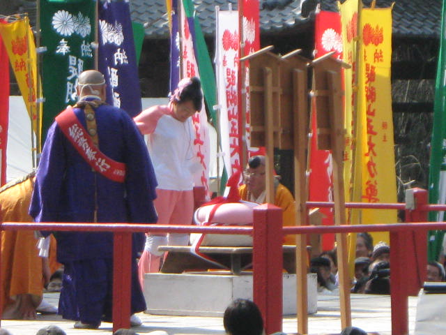 まず正午から女性の部。今年の参加者は20数人。三方自体が高さ20〜30cmの台の上に乗っており、その三方ごと持ち上げなければならないため、普通に引き上げるわけにはいけない。腰を落として三方を腰まで引きよせ、横の中央近くを持ち、お尻がつきそうになるくらいまで腰を落として持ち上げるのである。持ち上げることもできない人が2〜3割だろうか。半分ぐらいが1分もたない。横でマイクを持ったお坊さんが名前を聞き、時間を読み上げる。3分を超えると会場を取り囲んだ群衆から拍手が起きる。何人目かの女性が「5分」の声を聞いて三方を下した。力が抜けるのだろう。この日はピンクのジャージを着た若い女性が10分というこれまでの記録を1分以上更新する新記録で優勝。会場を大いに沸かした。後から聞けば新聞社の記者で、以前にこのイベントの取材をしたのが契機で、専門の道場に通って鍛えたとか。確かに同じ形で重さのもので練習しなければ記録は難しそうである。