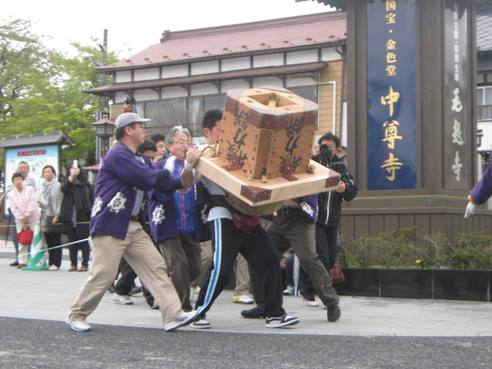 世界遺産登録で沸く平泉。GWは毎年藤原まつりが開催されますが、その最後を飾るのが平泉駅前で行われる弁慶の力餅競技。昭和元年から始まり今年(2012年)第87回と言う歴史あるイベントです。持ち上げイベントは全国各地にありますが、ここは重さ一辺が1mぐらいある巨大な三方の上に乗った餅米を三方ごと持ち上げ、どれだけの距離歩けるか、というルール。重さは160kgとのこと。腰に膨らんだ廻しを締め、その上に保存会の人たちが6,7人がかりで三方を持ち上げて逆さまに乗せます。手を離してスタート。予選通過ラインは10m。約20人が挑戦し、2回試みて通過者はわずか6名。過去最高は70数mだそうです。この日は最高が27m、続いて26m。午後からは決勝で、全員が2度ずつトライ。47年連続出場という人もいて、今年66歳。それで160kgを持ち上げたばかりか10m歩いちゃうんだからお見事。優勝は予選1位の人で32mでした。表彰式の後、最後に餅まきがあり、めでたく祭りは終了。(2012. 5. 3)