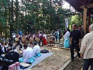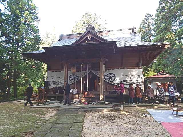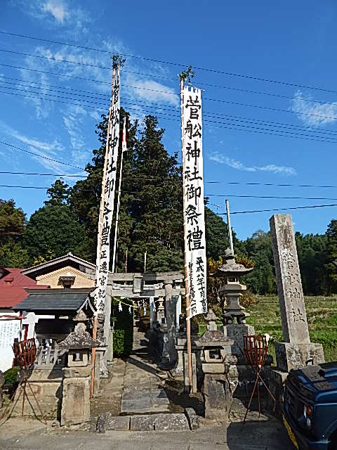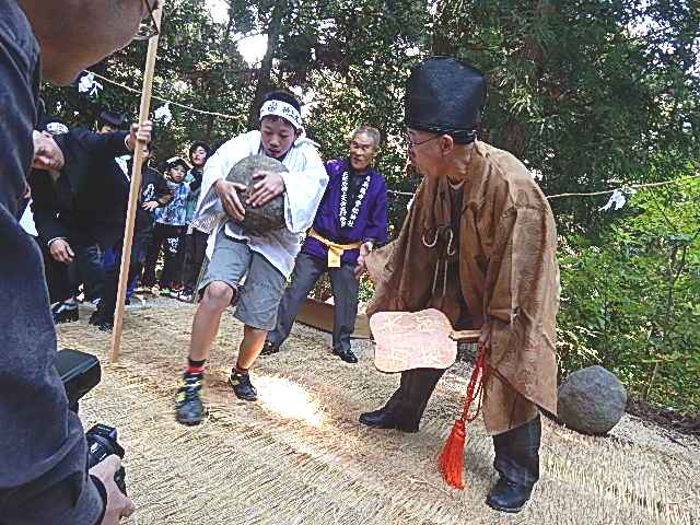 福島県須賀川市の菅船(すがふね)神社礼大祭の中で行われる石持ち上げの行事。 須賀川市は福島県南部の市だが、菅船神社はその東端。小塩江(おしおえ)地区にある神社である。市内中心部から小塩江地区まではバスの便がなさそうなので、須賀川市内ではなく、その北側の郡山市に泊まり、水郡線で小塩江へ。短いホームに簡易待合室があるだけの質素な無人駅である。国道を5分ほど歩き、横の山道へ。5、6分歩くと一つ山間の道路に出た。田畑が続くのどかな光景である。澄みきった青空に一本の幟が立っているのがわかる。目指す菅船神社礼大祭の幟である。近くには車がたくさん停まっている。大祭はもう始まっているようだ。細い細い参道を登って行くと、高いところに菅船神社はあった。中では裃姿の大人たちと巫女装束の少女たちが座っており、神事が行われていた。境内の一角には注連縄が張られ、中に筵が敷かれ、その上に2個の石が置かれていた。これから行われる持ち上げに使われる太郎石と次郎石である。太郎石は100kg弱、次郎石は約30kgとのことであった。その前には台が置かれ、上に賞品とおぼしき一升瓶と菓子などが置かれている。その横にはノートと鉛筆が置かれ、参加したい者が名前を書くようになっていた。
