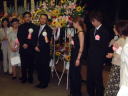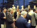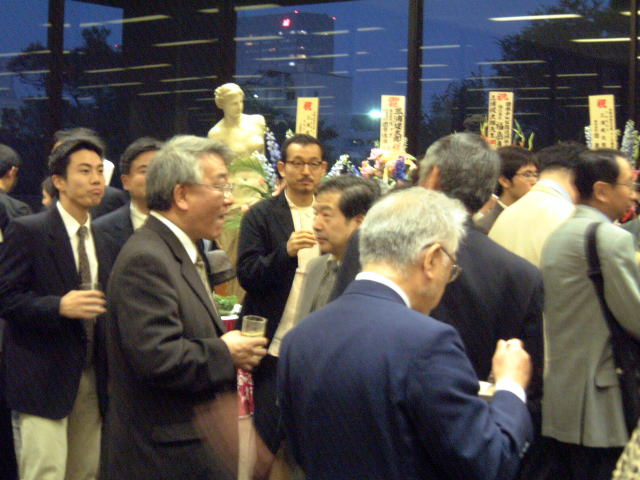 19時から場所を移して祝賀パーティー。何名招待したか分からないのですが、歩くのも苦労する状態。たぶん人が少ないときのためだったのでしょうが、朝日新聞広告局の人たちが「こんなに人が多いんなら、来る必要なかったなぁ。」とぶつぶつ言いながら、引き上げていきました。(笑) 会場に入る階段で、どこかで見たことのある男性を見つけました。横に回って名札を見ると日本放送協会。そう、BSマンガ夜話の関係者。「BSマンガ夜話の方ですよね?」と声をかけると、当たり! 別れ際に隣の女性が「夜話は業界の人にも人気があるんですね」と声をかけているのが聞こえましたが、わたしは業界人じゃない! 高取英さんの顔は相変わらず大きかったし、高新太郎さんもいつもながらガチャガチャ歩き回っていました。異様に雰囲気のある浦沢直樹さんや、きょうはあっさりTシャツの荷宮和子さんご夫婦。みなもとたろうさんが夏目さんと一所懸命歓談されているのを見かけました。講談社、白泉社を始め、出版社、編集会社の人も多い。読売新聞や漫画ゴラクとかも。 |