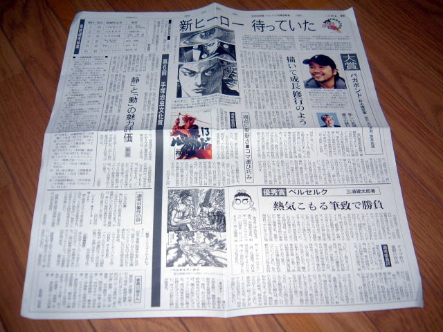 | 少しだけビデオも撮ってきました。かなり遠くから撮ったので、誰が映っているかも分からないような状態です。どうせ画像が荒れているならと、画質を落としました。でも、それなりのサイズがありますので、低速な回線でインターネット接続されている方は覚悟の上、クリックしてください。 音声だけをお楽しみください。(笑) 朝日新聞社箱島社長の挨拶 238KB 大賞受賞者井上雄彦さん挨拶(その1) 513KB 大賞受賞者井上雄彦さん挨拶(その2) 392KB 大賞受賞者井上雄彦さん挨拶(その3) 516KB 大賞受賞者井上雄彦さん挨拶(その4) 219KB 優秀賞受賞者三浦建太郎さん挨拶 398KB |
