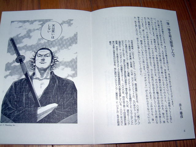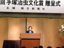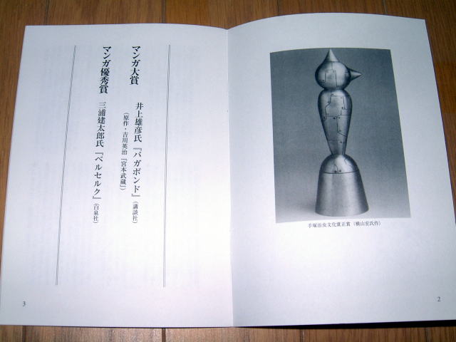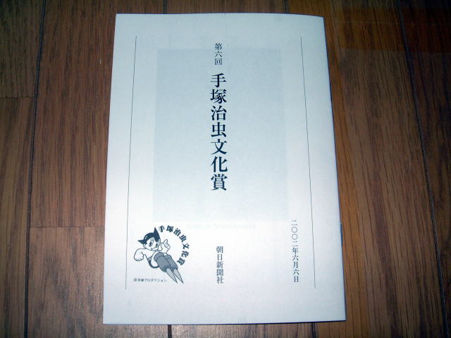 | 第6回手塚治虫文化賞の授賞式が6月6日18時より、東京・築地の朝日新聞社の浜離宮朝日ホール小会議室で開かれました。バガボンドの大ファンなので、賞の事務局にお願いして参加させていただきました。 小会議室って名前ほど小さい部屋ではなく、小ホールって感じでした。受付脇に席次表が置かれていたので覗き込んだら、ほとんどの方々は座席指定。ってことは、ほとんど来賓ってことですね。わたしのように一般参加だと、立ち見ってことかな? いしかわ先生は審査員なので、前の方の特等席。 仕事を終えて、17時半過ぎに会場に行ってみたら、まだ数名しか来ていない。いつもこんなに人が少ないのかなぁと心配していたら、マンガ評論家の米澤さんが現れたので、少しお話。 「今年は会場も狭いし、招待者もかなり絞ったんじゃないの?何か予算削減でもあったの?」と聞かれたのですが、確かに朝日新聞社の業績を調べると、前年比大幅な減益だけど前年度が過去最高だったからなぁ。 「審査員の謝礼って少ないんでしょうね」と聞いたら、苦笑いしながら「ま、そんなに多いわけじゃないけどね」の返事。でも、最近はどこの出版社も原稿料は出し渋るとか。 17時55分に、いしかわ先生到着。ホール入口で先生を見かけた女の子数名が「あ、いしかわじゅんだぁ」と叫んでいました。 18時5分に開会。 |