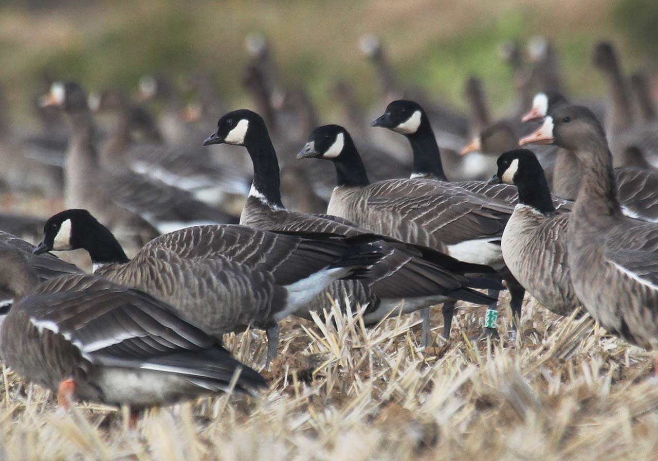 蕪栗沼の朝のカウントをしていたら、偶然シジュウカラガンの群が野谷地の水田にいたので撮影しました。よく見ると足輪がついています。