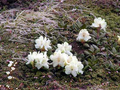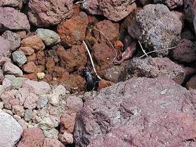 キタキツネやノスリ、あるいはヒグマなどは大雪山の生態系における食物連鎖の頂点に立つものですが、高山帯の昆虫群集の中にもそのような関係が見られます。昆虫の世界において植物連鎖の頂点にくるものは、多くの場合は捕食性の種です。 大雪山の高山帯において、最も代表的な捕食者はダイセツオサムシです。全体が黒色をした体長2〜3cmの甲虫です。そして後翅は退化しており飛行できないので、移動はもっぱら足にたよっている歩行虫類です。本種は、高山風衝地、岩礫地のような植生もまばらな高山帯の中でも最も厳しい気象条件をもつ環境条件の所に限って生息しています。 昼間はほとんど石下に身を潜め、夜の訪れとともに殺りくの俳徊に出かけるのです。お花畑で安逸をむさぼる高山蝶の幼虫も、ダイセツオサムシにとっては単に丸々と太った御馳走にすぎないのかもしれません。 生物は群集内で互いに食うもの食われるものの関係で、バランスが保たれています。その証拠には、登山道を歩いていると、キタキツネの落し去った糞の中から、これら殺りく者の変わり果てた姿がしばしば観察されます。 |