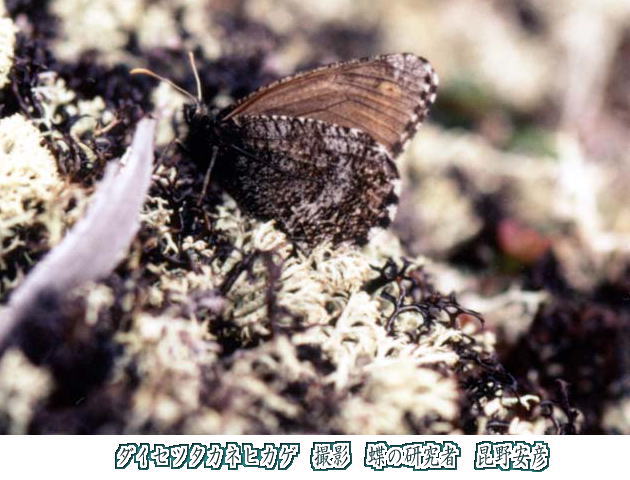 7月の尾根を歩いていると、何かに驚いたかのように足元か急に飛び立つ灰褐色の蝶をよく目にします。しかし、再び静止し場所を探しても、その姿を発見することは難しいでしょう。その蝶のもつ色彩があまりにも周囲の自然に溶け込んでしまうからです。ある人は、この蝶を“ハイマツ仙人”と呼びましたが、その地味で枯淡な姿からは、やはり氷河時代の末裔としての風貌が感じられます。華やかな同じ高地族の仲間とは異なり、すべてが地にできています。ダイセッタカネヒカゲは小泉岳や北海平のような荒涼とした礫原地に生息しており、ダイセツイワスゲやミヤマクロスゲを食草としています。成虫は6月下旬に出現し、7月上旬〜下旬が最盛期となります。食草や近くの地衣類などに産みつけられた卵は、その年にふ化しますが、本種は幼虫状態(若齢と終齢幼虫)で2度の冬を越します。そして、3年目の春に蛹となり再び羽化して現れてくるのです。 この蝶には面白い習性が観察されます。それは静止したとき、羽をぴたりと閉じたまま横倒しになることです。これは高山特有の強風への適応からくる習性かもしれません。 (保田 信紀) |
