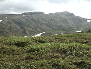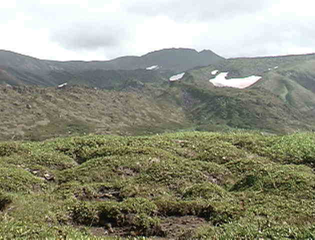 黒岳9合日のハイマツ帯の斜面を一気に抜けるとそこはもう黒岳山頂です。ぱっと開けた眼下に神々の遊ぶ庭(カムイミンタラ)とお鉢平(中央火口)、そこから黒岳左側にまっすぐ伸びてくる赤石川が見えます。 お鉢平の少し右の山に大きな雪渓が見えます。これが有名な白鳥と千鳥の雪渓をもつ北鎮岳です。 北鏡岳は、中央火口を取り巻く一番外側の外輪山(古大雪火山)の一つでそこから黒岳のほうへ凌雲岳、桂月岳と連なっています。 眼を左側の監視小屋から赤石川を通り越し、がれ場のむこうを見てみましょう。独特の形をした 烏帽子岳が見えませんか。浅野匠の守や 大岡越前の守が被っていたあの烏帽子です。どうです、見つけられたでしょう。その後ろが赤岳、時計回りに小泉岳、白雲岳と続いています。小泉岳は、なだらかな山なので見落とすかも知れません。これらの山々の内側にあってお鉢火口を取り巻く山(新大雪火山)は、前方少し左の赤石川の向こうから奥のほう時計回りに北海岳、松田岳、荒井岳、間宮岳、中岳とみることができます。又、黒岳からお鉢火口、間宮岳を結んだ向こうに大雪山の主峰旭岳が見えます。双眼鏡で覗いてみると山項にいる人を見ることもできます。