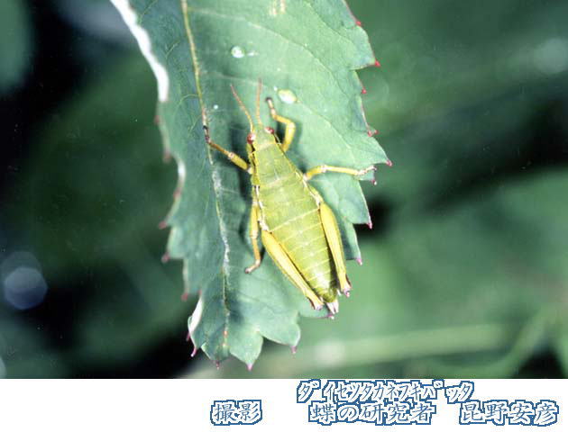 最近になって、大雪山の高地族の仲間に加えられた氷河期の落し子です。国外ではソ連のパイカル湖周辺から極東地方に分布しており、国内では北海道のみに分布しています。そして現在では、大雪山系のほかに、利尻山、暑寒別岳、芦別岳、斜里岳、羅臼岳の高山帯に生息ていることが確認されました。ダイセッタカネフキバッタは高山帯にのみ分布し、年1回の発生です。秋に土中に産みつけられた卵はそのままの状態で冬を越し、雪の融けた7月上旬にふ化した幼虫が出現します。このバッタの食性はかなり広く、種々の高山植物がその食料となっています。幼虫時代は茶褐色の地味な色彩をしているのであまり目立ちません。そして8月中句を過ぎると色鮮やかなグリーン色に変身した新成虫(体長2cm)が現われてきます。しかし成虫といっても羽はまったくありません。 この羽無しバッタの出現する頃は、すでにほとんどの高山蝶は姿を消しています。そのためこの季節に観察できる最も代表的な高地族です。そして個体数も大変豊富で、雲の平のようなチングルマやキバナシヤクナゲのお花畑のいたるところで観察できます。 (保田 信紀) |
