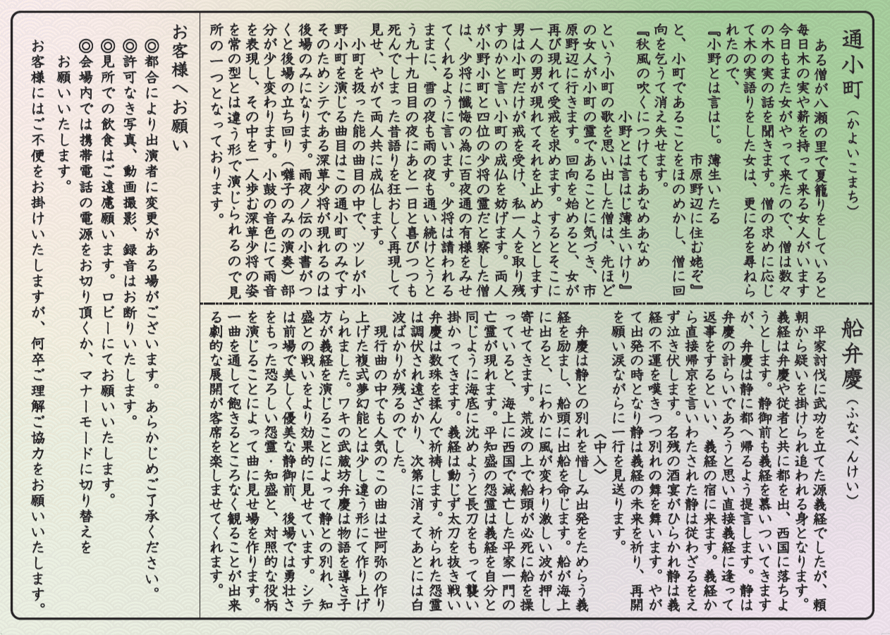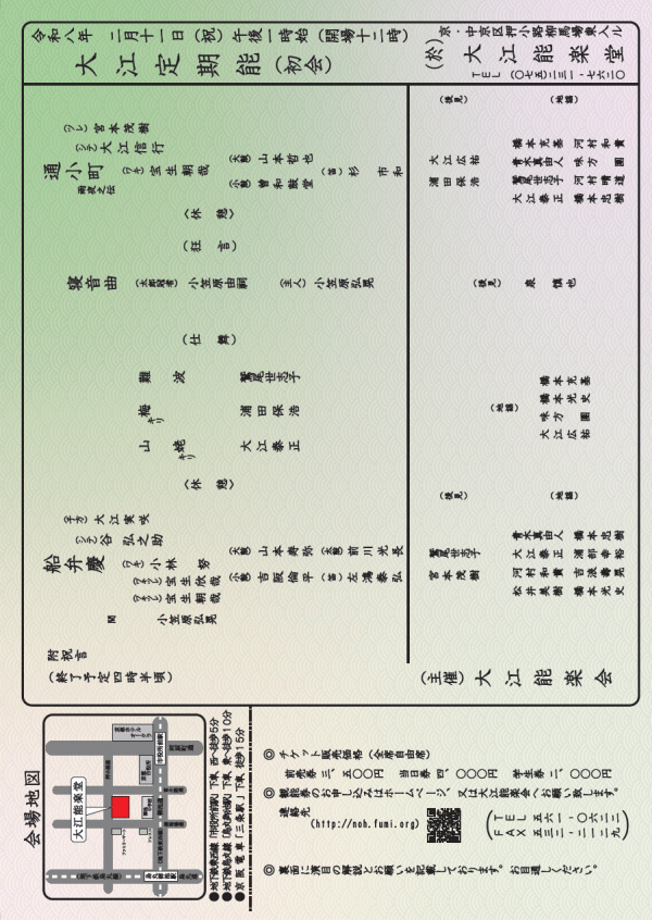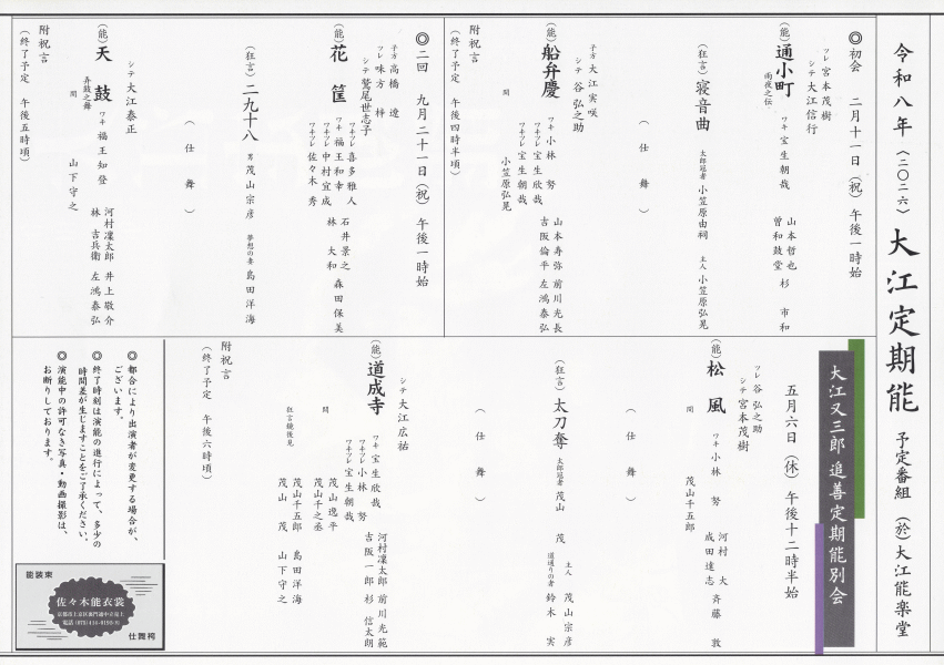 電話 自宅(075-561-0622) 能楽堂(075-231-7620)にてお願いいたします 各回の番組は出来上がり次第、載せていきますのでお待ちください。(演能日より約1ヶ月前に掲載予定)