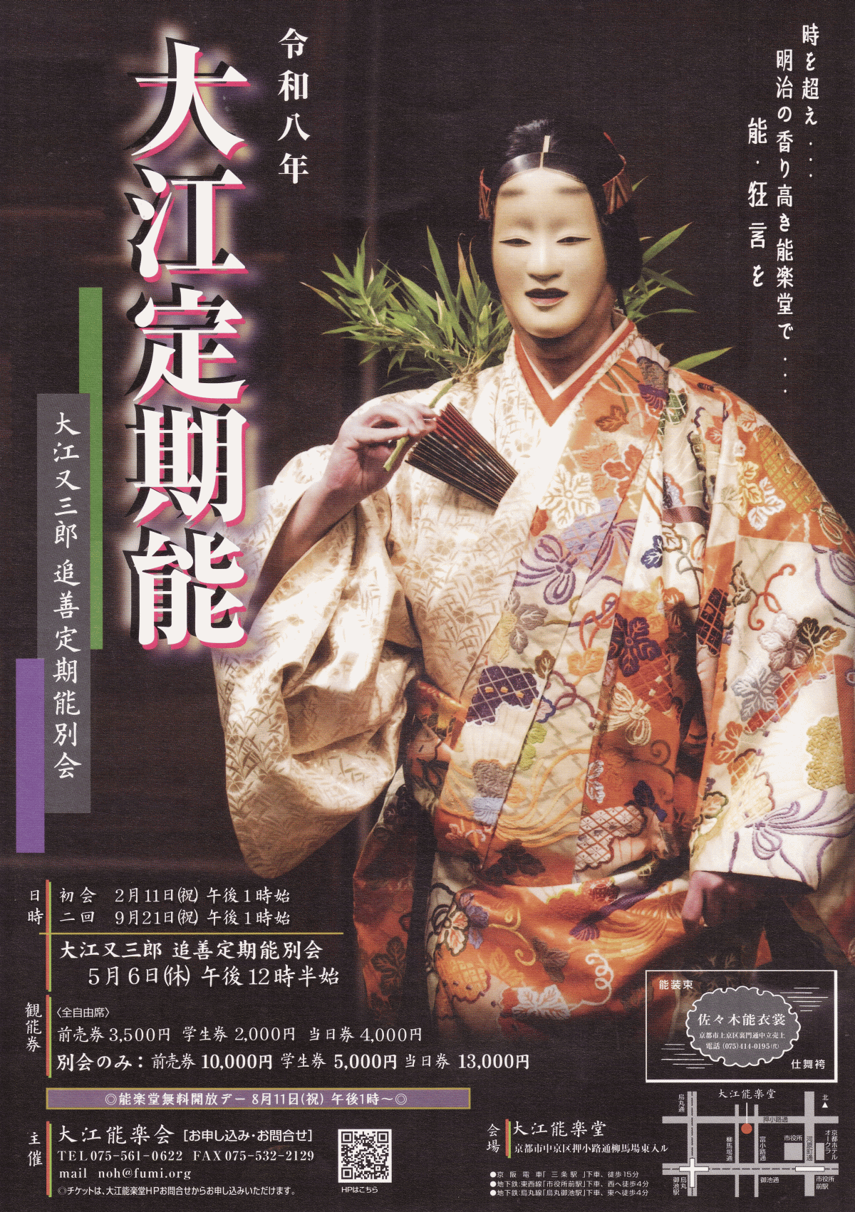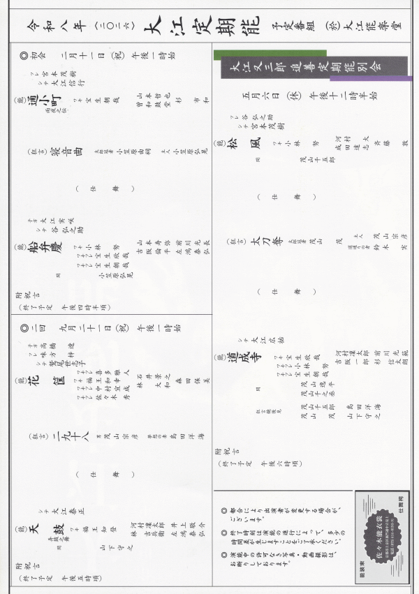 大江能楽堂では年4回、大江定期能を催しております。年間番組は下に掲載。各回の定期能番組はページ下層に掲載しております。尚、番組についてのご質問あるいは切符のお申し込みなどにつきましては上部メニューのお問い合わせよりお申し込みください。