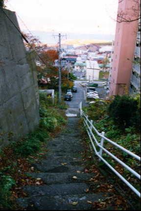 東坂の先に、「あたご坂」と呼ばれている短い坂がある。道営住宅の脇までは舗装道路となっているが、その先は朽ち果てた階段が函館山に向かって続いている。 坂の名前の由来は、いろいろと調査したものの、現在のところはっきりしていない。 階段の途中には、この階段を通らなければ行き来が出来ない家があり、正に「生活道路」となっている。しかし、あの家は、この階段を人力で資材を運び上げて立てられたのだろうか? |