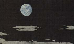 これは昨年公開された月周回衛星「かぐや」がハイ ビジョンカメラで撮影した月の地平線からの地球の 画像です。(JAXA・NHK提供) これを見た時、シュールな美しさに感動を覚えたと同時 に既にどこかで見たような懐かしい感じがしましたが 思い出せず、ずっと心に残っていました。しかし昨日 (5日)の東京新聞の「葛飾区郷土と天文の博物館」の 上映会案内記事の同じ写真を見た瞬間やっと以下の絵を 思い出しました。 |