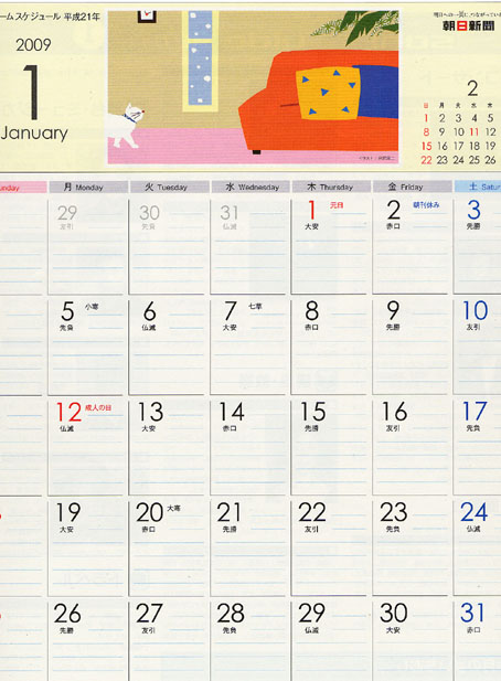 朝日新聞の毎月配達されるカレンダーのイラストです。(2009)