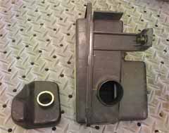 レゾネータは吸気音を軽減させるために付いている機構です。構造は、インテークタイプにくっついた空箱なのですが、これが吸気の脈流と共振して、うまい具合に音が消えるそうです。アイドリングから高回転域まで3つのレゾネータがありますが、一番大きいもの(たぶん、アイドリング用?)はエアクリの外側にあるようです。あとの2つは、エアクリとスロットルの間のパイプに付いています。エアフィルタを交換するついでに、エアクリBOXの上についた2つのレゾネータを外してみることにしました。