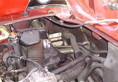 | インテークパイプから、レゾネータまで 全部とっぱらったエンジンルーム。 奥に見える配管はガソリン給油口 その奥に、サイドエアダクトが見える。 |