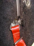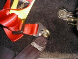 さて、今度は左側です。左側の純正シートベルトは、シート(レール?)自体に止まっているようです。センタートンネルの陰になって外すのも結構面倒です。それに、フレームに直付けできないので安全性に問題があるかもしれません。そこで、シートレールを止めているボルトに付けることにしました。ここのボルトは、センタートンネル(フレーム)から直にボルトが飛び出す構造になっていて、ナットで取り付けます。ですから、ここにアイボルトを使うことはできません。仕方がないので、ホームセンターで買った金具を当てて、その金具にシートベルトのフックをひっかけることにしました。平たい金具とフックが上手く合わず、少々不安のある止めかたですけど、まあなんかなるでしょう・・・