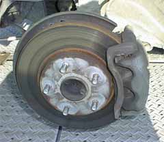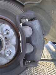 | フロント・ブレーキの外観 関係ないけど、ブレーキローターって車軸に固定されていません。 タイヤを外すとガタガタと揺れて、キャリパーだけで止まっている感じです。 |