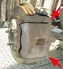 | キャリパーの部分のクローズアップ 矢印の部分に14mmのボルトが2本あるので外します。 あまり強いトルクで締められてはいないので、簡単に外れます。 でも、うちの安物ラチェットでは、ナメかけてしまいました(^^;) やっぱ、安物工具はダメですね・・・ |