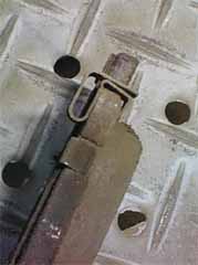 | 矢印部分のバネが付いている場所を忘れないように これは純正の内側のパッドです。白っぽい丸はキャリパーのピストンの 跡で、銀色のシムに付いています。この裏側には黒くてスリットの入った シムも付いています。 矢印の場所には、小さなバネが付いています。 パッドが減ったとき、ローターにこすれてキーキーなる物だと思います。 |