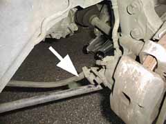 | 邪魔をする、サイドブレーキワイヤー 矢印のワイヤーは、サイドブレーキのワイヤーです。これが結構堅くて キャリパを上に跳ね上げることを邪魔します。無理矢理持ち上げれば、 なんとか交換可能なくらいは持ち上がりますが、ワイヤーにストレスを 与えそうで気が引けます。サイドブレーキ・ワイヤーを外してしまうのが、 もっとも安心できる方法ですけど、キャリパに隠れて手探り状態での作業になり ちょっと厄介です。 |