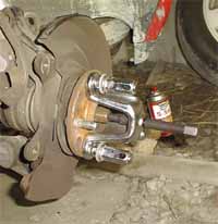 | ナックルを外して、ベアリングの様子を調べてみることにした。ドライブシャフトのナットを外した時の様子が左の写真。ハブのスプラインに比べ、ドライブシャフトが少しひっこんでいる感じ。この分ハブが手前に浮いてしまったのだろうか? ナックルを外してみたが、ベアリングに軸方向のガタは無かった。ずれた状態で固定(固着)されているのか、ベアリングのボールかカラーのガイド部がすり減っているか、どちらかなのかもしれない。ただ、ベアリングを裏から見た感じでは、軸方向にずれた形跡が無いので、すり減ったか割れた可能性が大きそうに思える。ナックルを外す様子は上で紹介している。 |