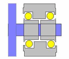 | ハブベアリングって、インナーカラーが真ん中で分離するようになっていて、なんと、外れてしまいます(^^;) ちなみに、インナーはハブのシャフト部分に圧入し、アウターはキャリア(ナックル)に圧入して使います。写真で見て分かるように、インナーの外側は広がっておりボールが外に飛びだなさいようになっています。また、アウターの真ん中あたりに段があり、ボールが奥にひっこまないようになっています。インナーとアウターに挟まれてボールは回ります。 | ボールは等間隔にならんでいますが、これをガイドしているのは、黒いプラスチック製と思われる部品です。これで、ベアリングがこの位置から動かないように固定しています。このおかげで、インナーを外してもボールはバラバラになることはありません。中にはたっぷりとシリコン・ラバーグリスが詰まっています。 | 図にすると、こんな構造です。黄色いのがボール、灰色がカラー、青いのがハブ(アクスルシャフト)です。この図では上下方向はボールにしっかり押さえられ強度がありますが、横方向はカラーの段差や飛び出した部分だけで押さえる構造です。 |
