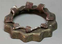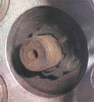 上の写真は、右のロックキャップの様子。全体的にロックキャップをひっかける為のデコボコがなぎ倒されているが、特に手前の半周分はデコボコが引きちぎられたり、ぺちゃんこになるまで押しつぶされている。コッターピンが、ロックキャップ自体に当たって、ロックキャップが回らなくなり止まっているようだ。つまり、コッターピンのおかげで、ホイールが外れずに済んでいるわけだ!! でも、きっと、これも時間の問題だろう・・・