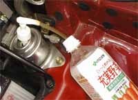 | 空っぽになったら、ロウトを使って新しいフルードを入れます。こぼすと、 塗装面を痛めたりプラスチック部品を侵しますので注意が必要です。 |