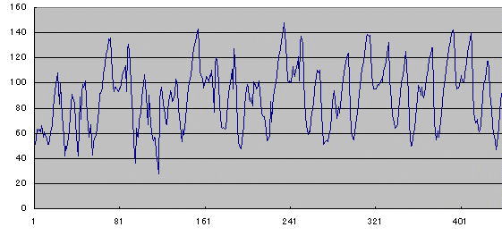 だめじゃ、こりゃ(笑) データは、2002.10.12のTC2000での30分間の走行軌跡です。 コース幅一杯にいろんなラインで走ったように見える軌跡ですが、そうじゃなくって、誤差で軌跡が広がっています(^^;) S字の処を見るとよく分かります。直線的に走っているのでS字にはなってませんが、幅は広いです。±5mくらいの誤差はありそうですね。時々大きくコケるのか、コース外も走っています(笑)