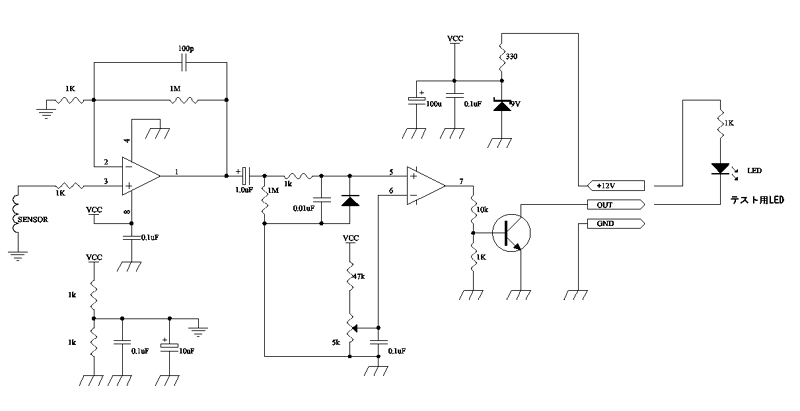 動作保証は一切できませんが、回路図を公開します。ICは汎用OPアンプで良いでしょう、トランジスタも汎用小型品が使えます。部品代は800円以下(買い方で大きく変わるが)でしょう。動作実績はあるので、あとは、組み方と使い方だけかな? 市販品のように完全無調整とはいきません、多少の苦労はありそうです(^^;)