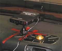 | ダッシュボードの上に、専用の台を使って貼り付けます。結構良さそうな台ですが、実は似たようなカーナビモニタ用の台が車に乗っています。最近の流行でしょうか? カーナビの台は今は使っていませんが結構良かったです。何処に取り付けるか決めてなかったので、今回はビニルテープで貼り付けただけで仮設してみました。電源は、シガライタから取るケーブルが付属しています。仮設ということで、電源もシガライタから取りました。設置のポイントは、装置から前の車がちゃんとみられる場所に置くことです。どんな距離でも安定させて動かすには、赤外線の光が水平になるようにしなくてはなりません。古めのトヨタ車はダッシュボードが高い位置にあるので問題ありませんが、ホンダ車なんかは、装置は結構高い所に持ち上げないとダメでしょう。車の前でしゃがみ込んで、ちゃんと装置が見えるか確認しましょう・・・ | ![]() |