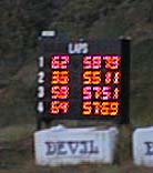 | 茂原名物?の電光掲示板です。これにラップタイムが表示されるので、走りながらにして見ることができます。一番左側の2〜3桁の数字が計測器の番号(今回私は61番)、左側の4〜5桁の数字がラップタイムです。この真ん中に、総合順位も出ますが、左の写真にはありません。 計測ポイントは、チェッカーフラッグなんかを振るためのお立ち台近辺にあり、ここを通過したときに表示がでます。車はストレートを立ち上がる途中で、比較的ヒマ?な時なので、ちらっと、ゆっくり見ることができます。表示は、1番目→2番目→3番目→4番目→1番目のように、書き変わってゆきます。書き変わった瞬間を見届けるか、目的の計測器番号を覚えていないと、どの車がどのラップなのか少しわかりにくいようです。でも、今の走りが何秒だったか、即分かるのはとてもファイトが沸いて良いですね! |