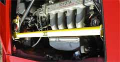 | インフォメーションが掴みやすくなるかと期待したリアタワーバーでしたが、得られたものは、リアのトラクションでした。LSDが凄く良く効くようになります。コーナリングでリアの接地が上がるようで低速時からコントロール性があがりました。擬似的にリアのバネレートを上げる効果があるような感じです。乗り心地が良くなったり、リアが踏ん張るようになった感じはありません。インフォメーションも以前と変わりません。これだけ変化があるようなら、フロントにも入れたくなってきました。 問題点は、エンジンフードを開けた状態で固定するステー(棒)が、干渉してしまい取り付け不能です。現在外して運転席シートの後ろに放り込んであります。あと、エンジンフードの断熱材の一部が干渉してタワーバーに接触します。いまは、タワーバーに後が付いています。3型エンジンとか、ターボ車なんかだと干渉しないのかもしれませんが・・・ |