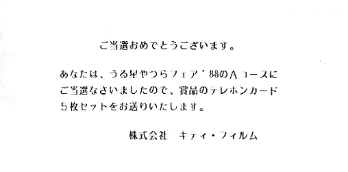で、私はこれに応募した結果、幸運にもA賞に当選!。豪華ケース入り特製テレカを入手出来たのでした(^^)。いやぁ、これは嬉しかったですねぇ。うる星やつらが好きで好きで追いかけてきて、そして完結編を向かえて、そう言う時だっただけになおさらでした。単に幸運だったと言うだけじゃないなにか、そう言うものを勝手に感じて感激した覚えがあります(^^)。