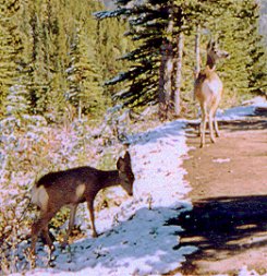 Jasper national park is very large area at the east of the Canadian Rocky Mountains. There are many mountain trail. Many people enjoy their out door life by their trailer house. We walked trail from Miette Hot Spring for the beginner to watch the wonderful view of Japser National Park. ![]() Snow accumulated thinly on the mountain trail though it was still September. When we turned on the corner of the mountain trail, the parent and child of the deer (White Tailed Deer) was walking freely. |