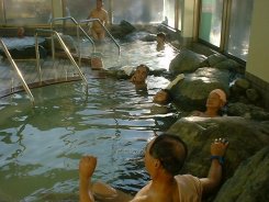 ![]() ■印象 内風呂は2つあって、岩を組み合わせた岩風呂という雰囲気だ。一方はぬるめになっていて、そちらの方が人気だ。みんなゆっくり浸かっている。あとで聞くとこちらが源泉のままのお湯だそうだ。 泉質はナトリウム・カルシウム硫酸塩塩化物泉(アルカリ性低張性温泉)、源泉の温度は41.8度、PHは9.33でアルカリ度は高い。黄緑色のやわらかいお湯だ。 ![]() 露天風呂はかなり広い。ややぬるめでこちらも長湯が楽しめる。周囲に高い建物がないので、眺めもなかなか良くて開放的だ。 食堂は無いが弁当は販売している。眺めのよい高台にある公営温泉はけっこう気に入った。中央道で東京からアクセスのよいところだ。 |