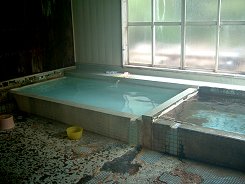 浴室は古びていてタイルがはげた所もあるが、使い込まれていてよい感じだ。窓際に2つの浴槽がある。左は熱湯、右はぬる湯だ。どちらもかけ流し、お湯は透き通っている。