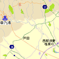 東北自動車道の西那須野塩原ICを降りて、国道400号線を塩原方面へ、関谷北の交差点を那須湯本方面に右折。県道をしばらく走り戸田の交差点を板室方面に左折し、しばらく走ると「幸乃湯」の看板があり左折するとすぐ。駐車場は広い。