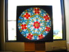 紙の丸い箱の蓋(紙を外したもの)に障子紙を貼り、その上に模様が描かれた厚画用紙を貼ったものです。 この作品例は、こんなものも描けますという例ですが、模様を描くこととデザインナイフで模様に沿って切らなければならないため、特別支援学校の子どもたち向けにはならないかもしれません。高等部の生徒さんなら作れるかもしれませんが・・。 図工・美術の作品にはちょっとという感じですが、星を描くだけでなく色々な模様や風景なども表現できるという例にはなるでしょう。 |