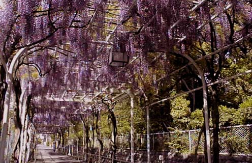 | 2000/5/11公開。たこいの新居のとなりの焼津中学の脇道の藤棚です。奥の鬱蒼とした林は焼津神社の敷地です。たこいのアパートはこの藤棚からちょうど中学校をはさんで反対側にあります。この藤棚は初めてみつけてからもう何年も写真に撮りたかったんですが、ちょうどほどよく咲いているところでカメラを持って通りかかるということがなくてずっと撮り逃していたものですが(笑)、今年は撮影に成功した、ということで(笑)。しかし焼津中学とか焼津神社とかなんだか焼津づくしですが、なにしろ住所が焼津市焼津という界隈なので、まあそんなもんです(笑)。 |