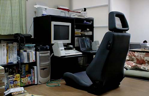2001/2/6公開。なんか、たこいの部屋シリーズが続きますが(笑)、最近導入した大馬鹿グッズのレカロ座椅子(笑)。愛車のジェミニのシートの布地が擦り切れてきたので、廃車になった同車種から取得したシートに交換して、余ったシートをそのままもらってきたもの。まあ、腐ってもレカロ(笑)、座り心地は絶品です(笑)。